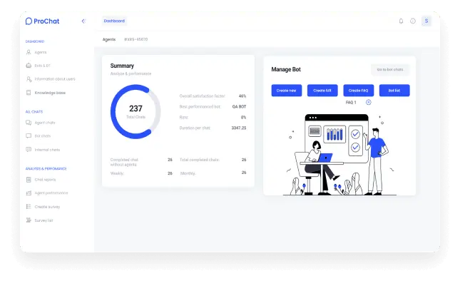 - Performance metrics, including survey statistics, chat reports